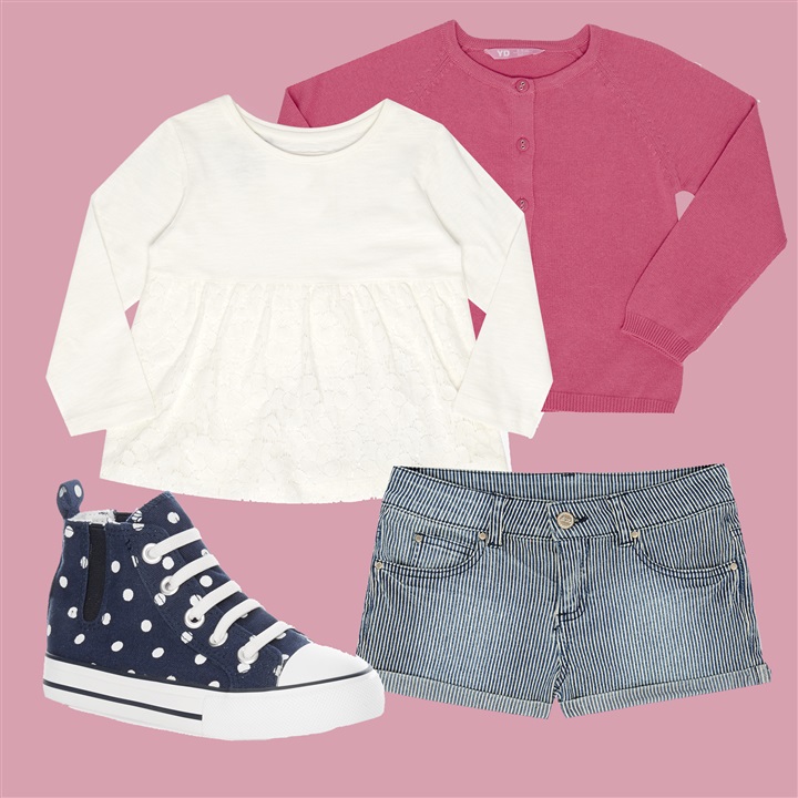 Con estas adorables zapatillas de lunares y estos monísimos shorts a rayas finas, podrá presumir de un gran estilo antes de tiempo.