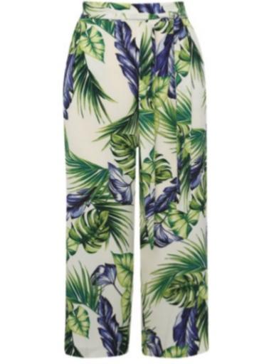 Los de culottes son cortos, anchos y a la cintura es ideal para esta temporada ya que es de una tela ligera junto con un hermoso estampado tropical con hermosos colores en tendencia; este año estará muy en voga el verde vivo junto con el azul, que mejor que en un pantalón como este.