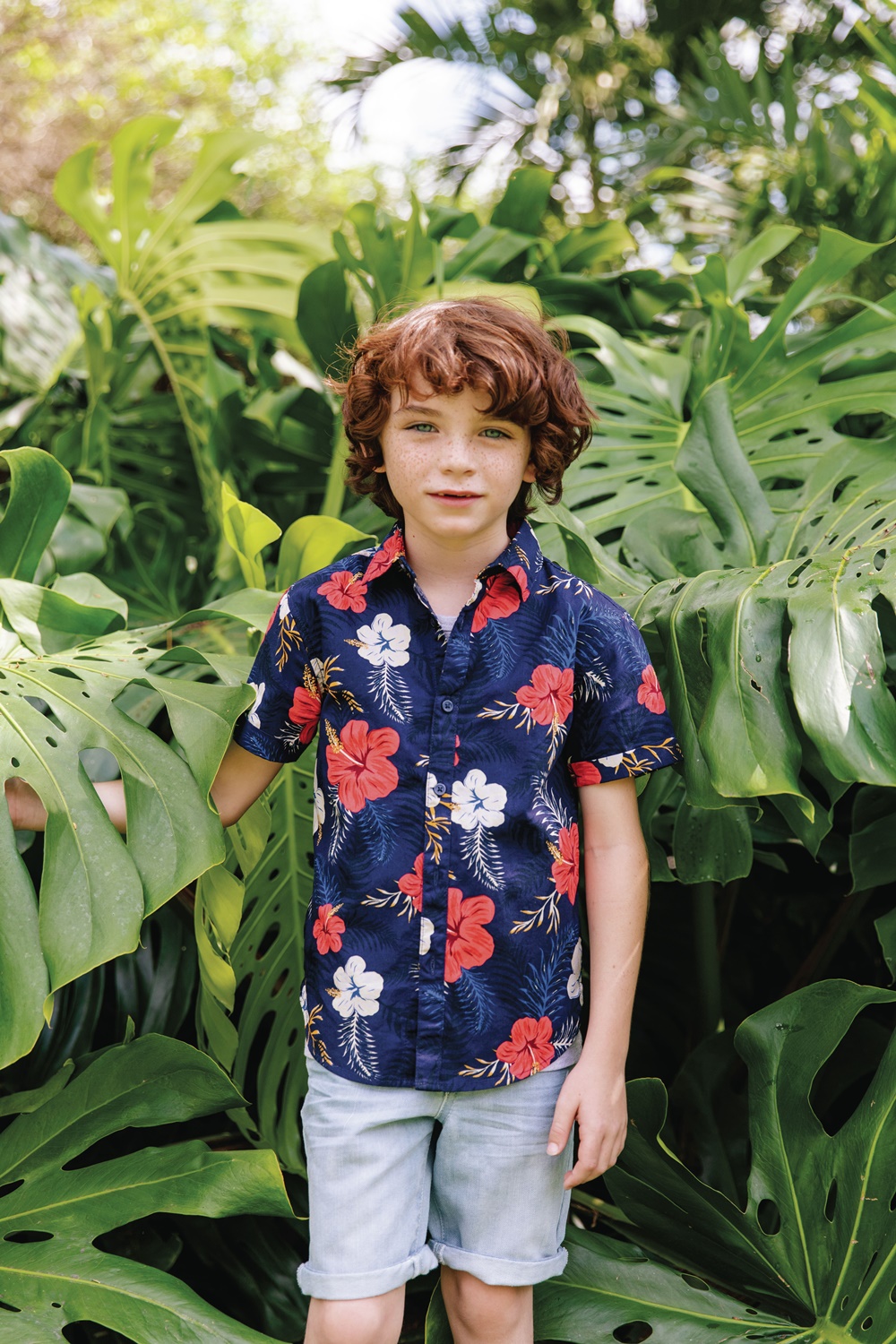 El siguiente conjunto es una camisa de botones y de manga corta en color azul marino y con flores de playeras de decoración alrededor de toda la camisa que son de color blanco y melón con hojas de palmera.