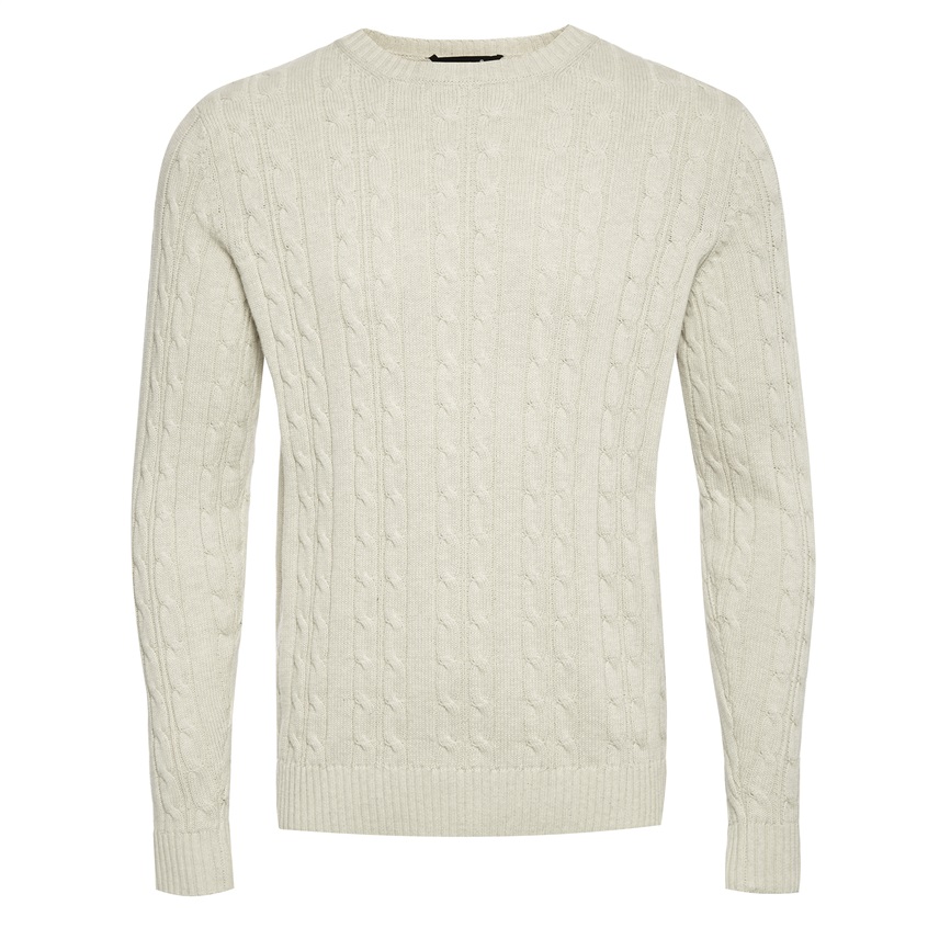 Este jersey de ochos color crema es superclásico. El diseño limpio con cuello redondo mantiene un look pulcro y moderno.