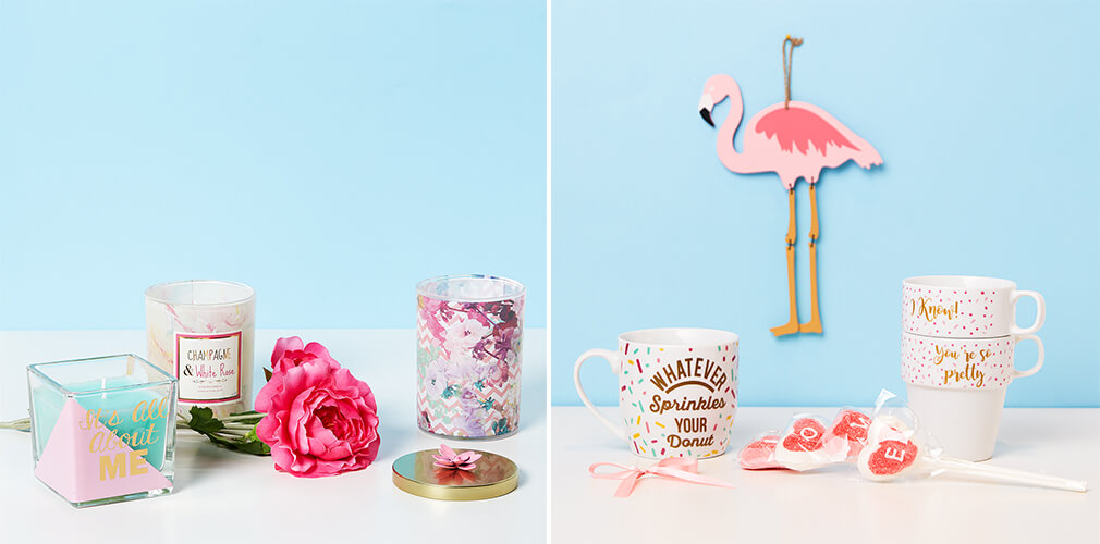 Vela en vaso con mensaje 3,50 €, vela en vaso efecto mármol 4 €, vela en vaso con motivo floral 6 €, taza con donuts 4 €, pack de 2 tazas apilables 4 €, decoración de flamenco para colgar 1,50 €